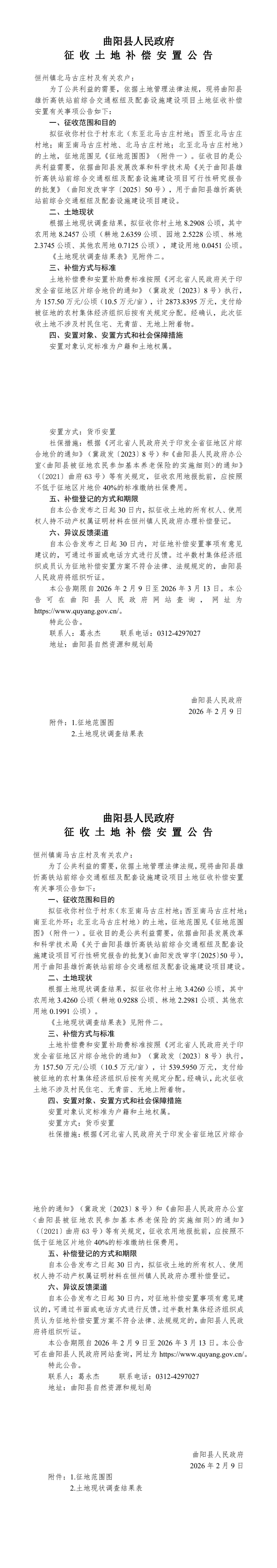 曲阳县雄忻高铁站前综合交通枢纽及配套设施建设项目《征收土地补偿安置公告》