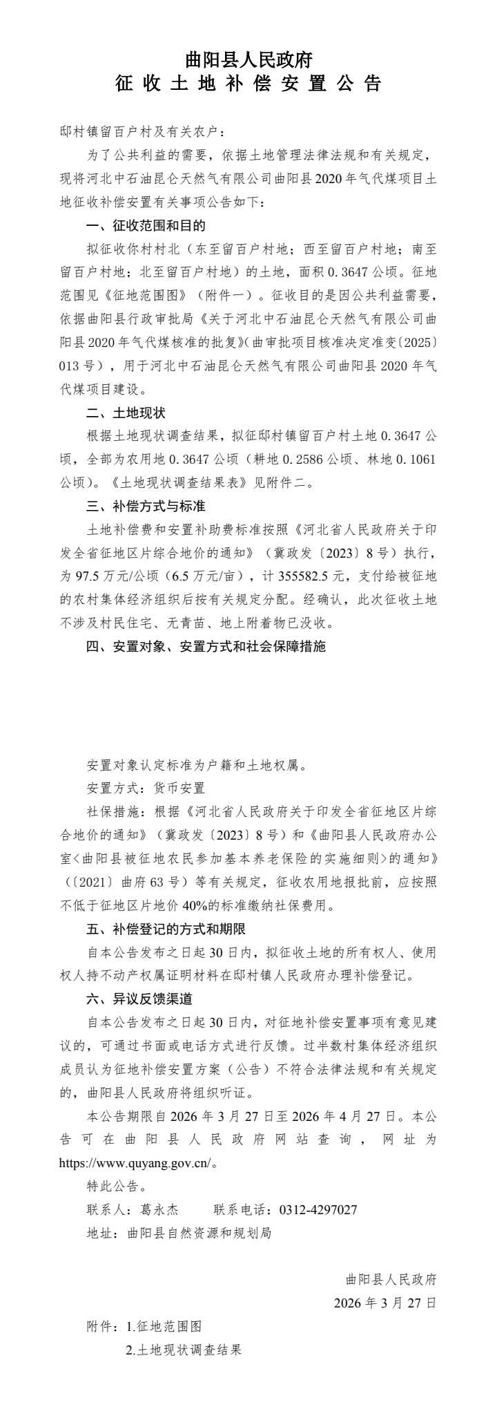 河北中石油昆仑天然气有限公司曲阳县2020年气代煤项目征收土地补偿安置公告