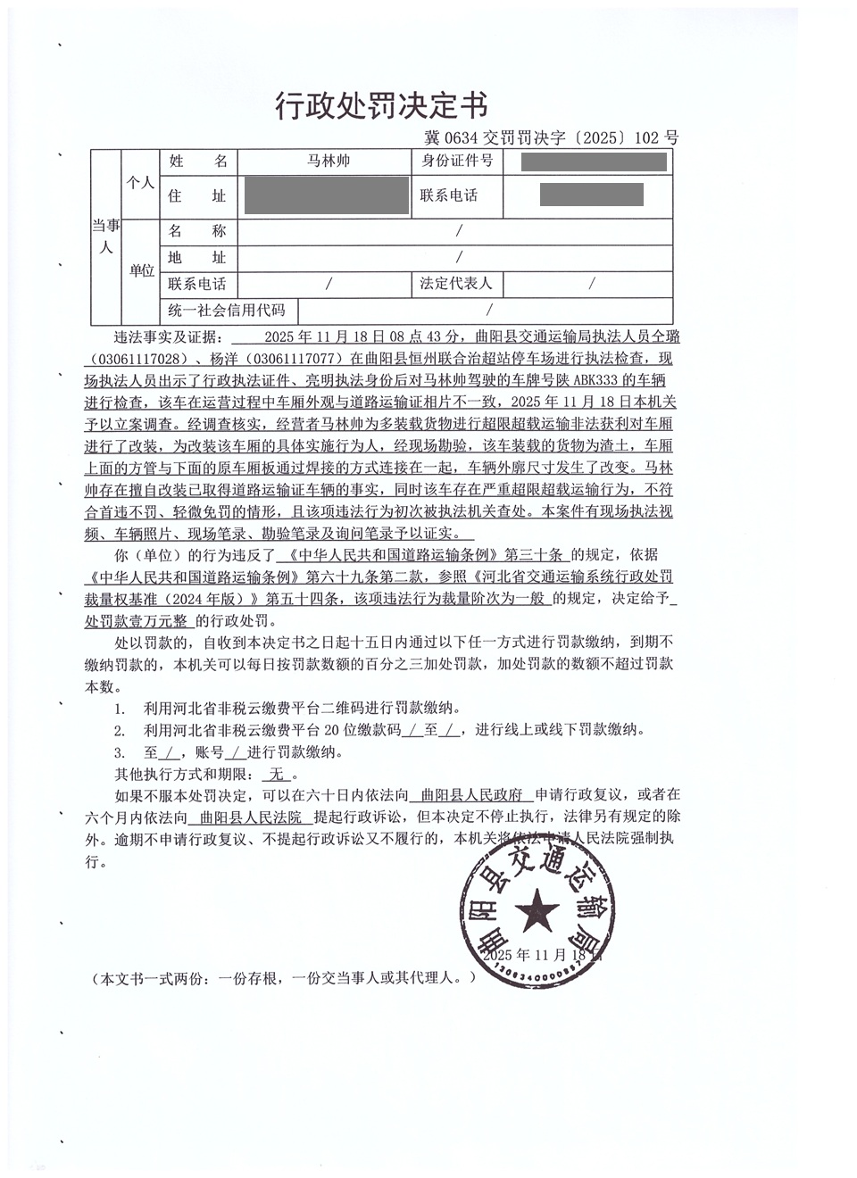 马林帅擅自改装已取得道路运输证的车辆冀0634交罚〔2025〕102号