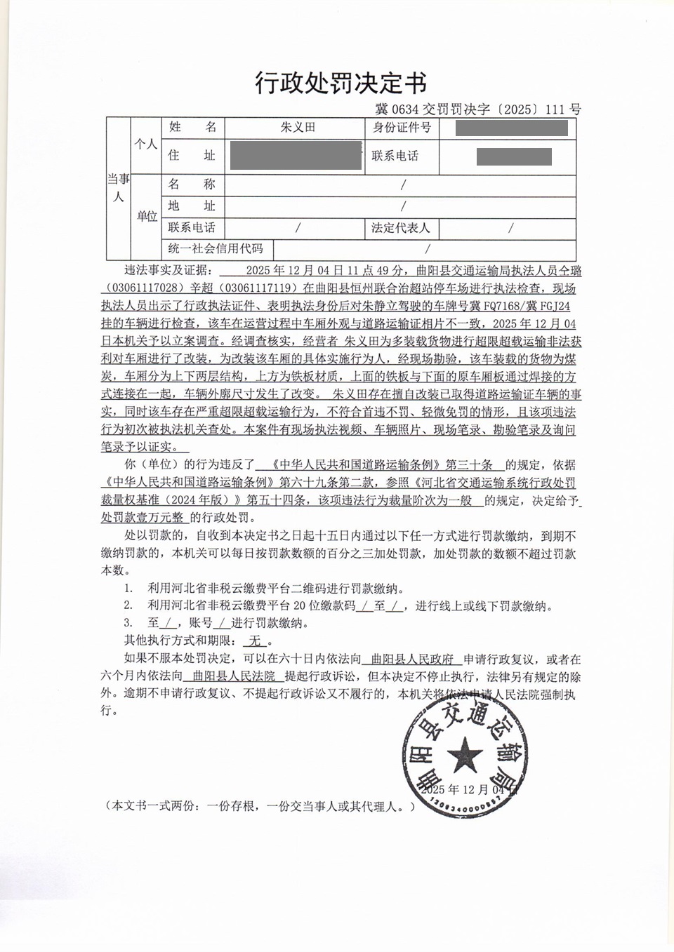 朱义田擅自改装已取得道路运输证的车辆冀0634交罚〔2025〕111号