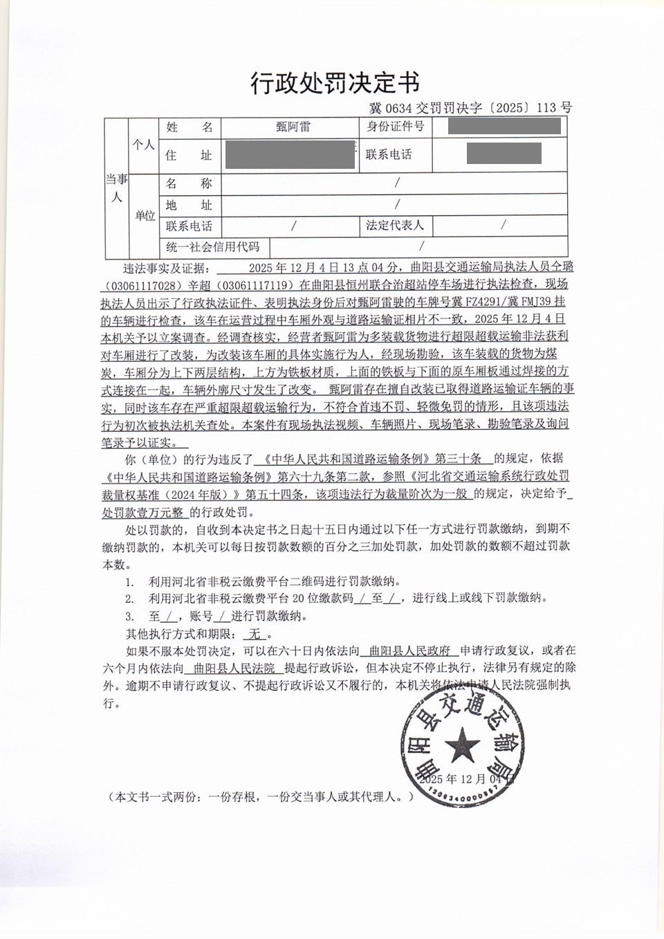 甄阿雷擅自改装已取得道路运输证的车辆冀0634交罚〔2025〕113号
