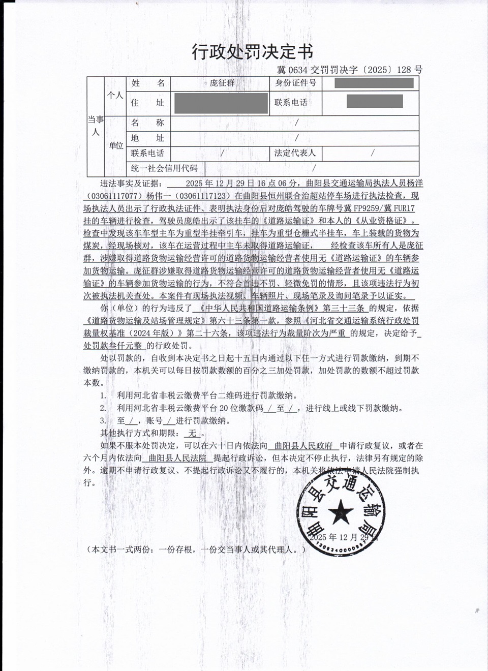庞征群取得经营许可的经营者使用无道路运输证的车辆参加经营等行为冀0634交罚〔2025〕128号