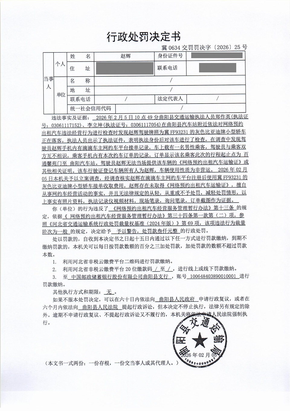 赵辉未取得《网络预约出租汽车运输证》,擅自从事网约车经营活动 冀0634交罚〔2026〕25号