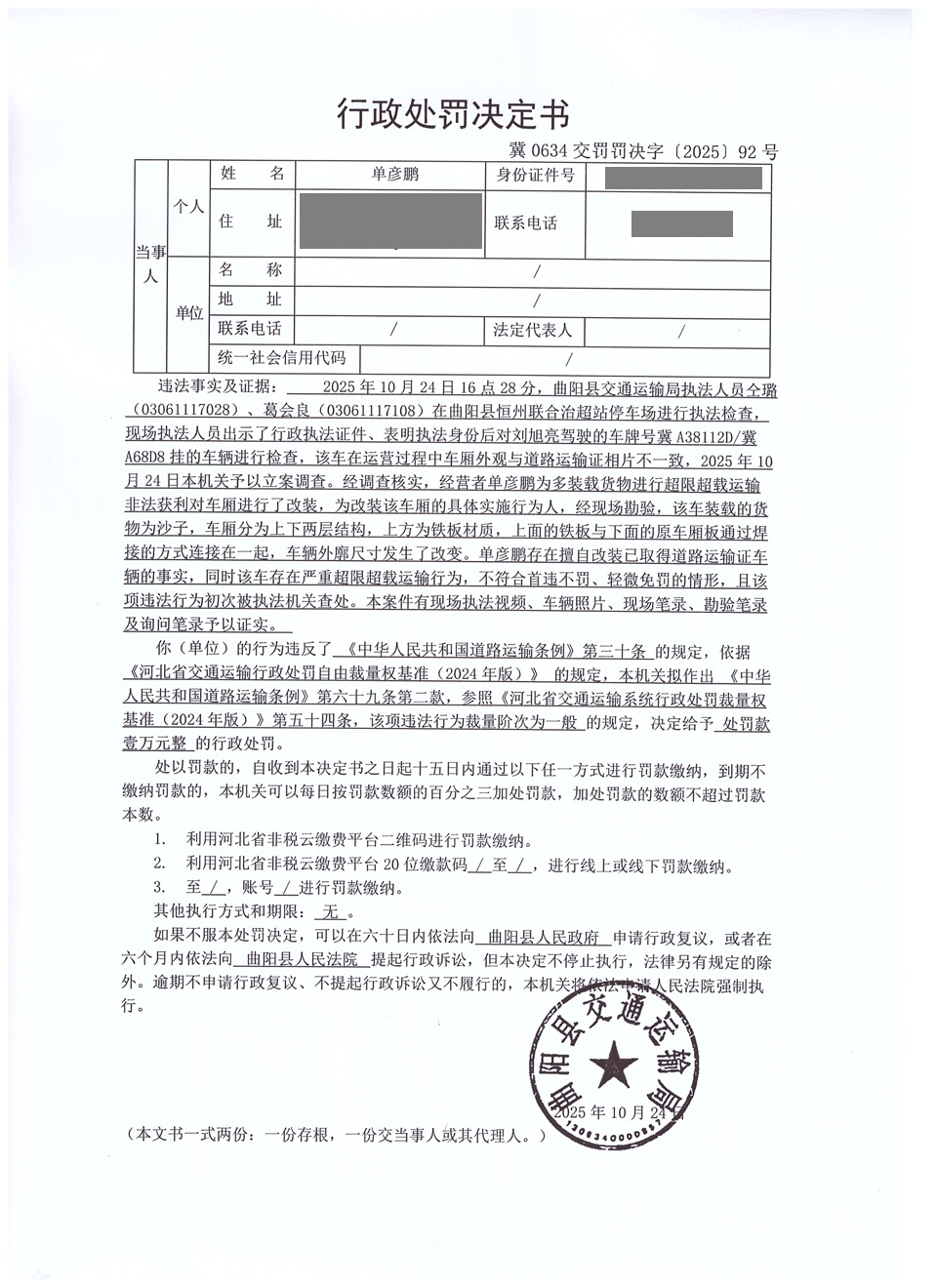 单彦鹏擅自改装已取得道路运输证的车辆冀0634交罚〔2025〕92号