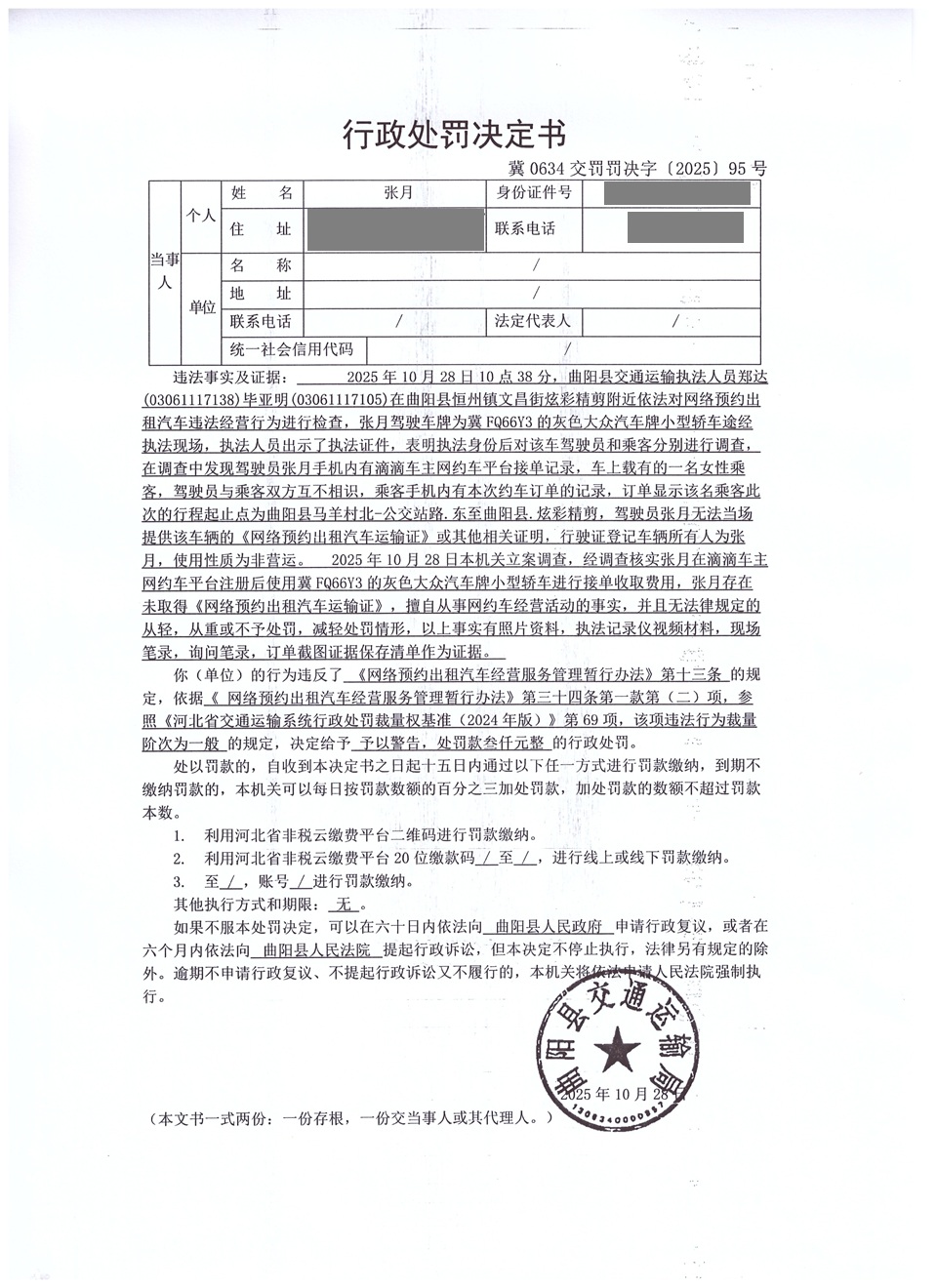 张月未取得《网络预约出租汽车运输证》,擅自从事网约车经营活动冀0634交罚〔2025〕95号