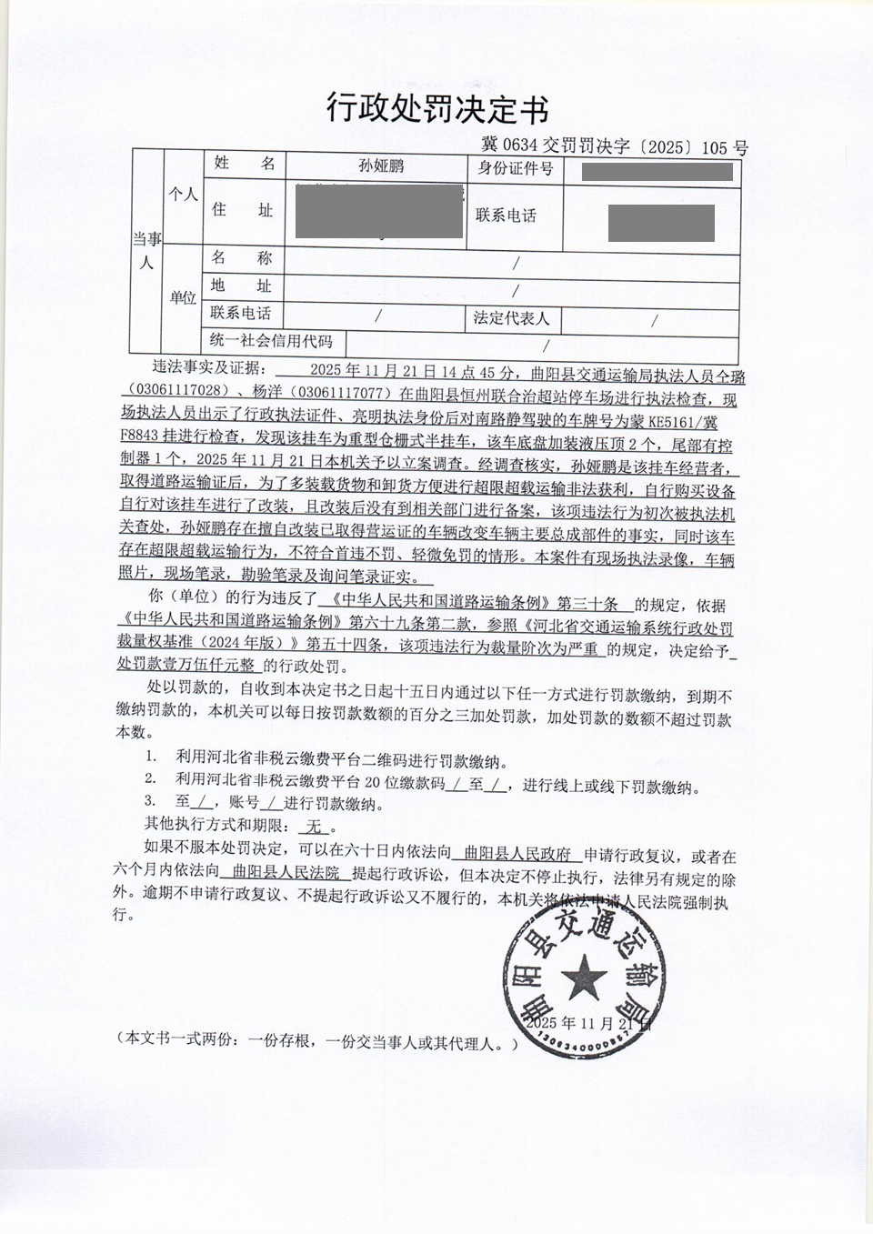 孙娅鹏擅自改装已取得营运证的车辆冀0634交罚〔2025〕105号