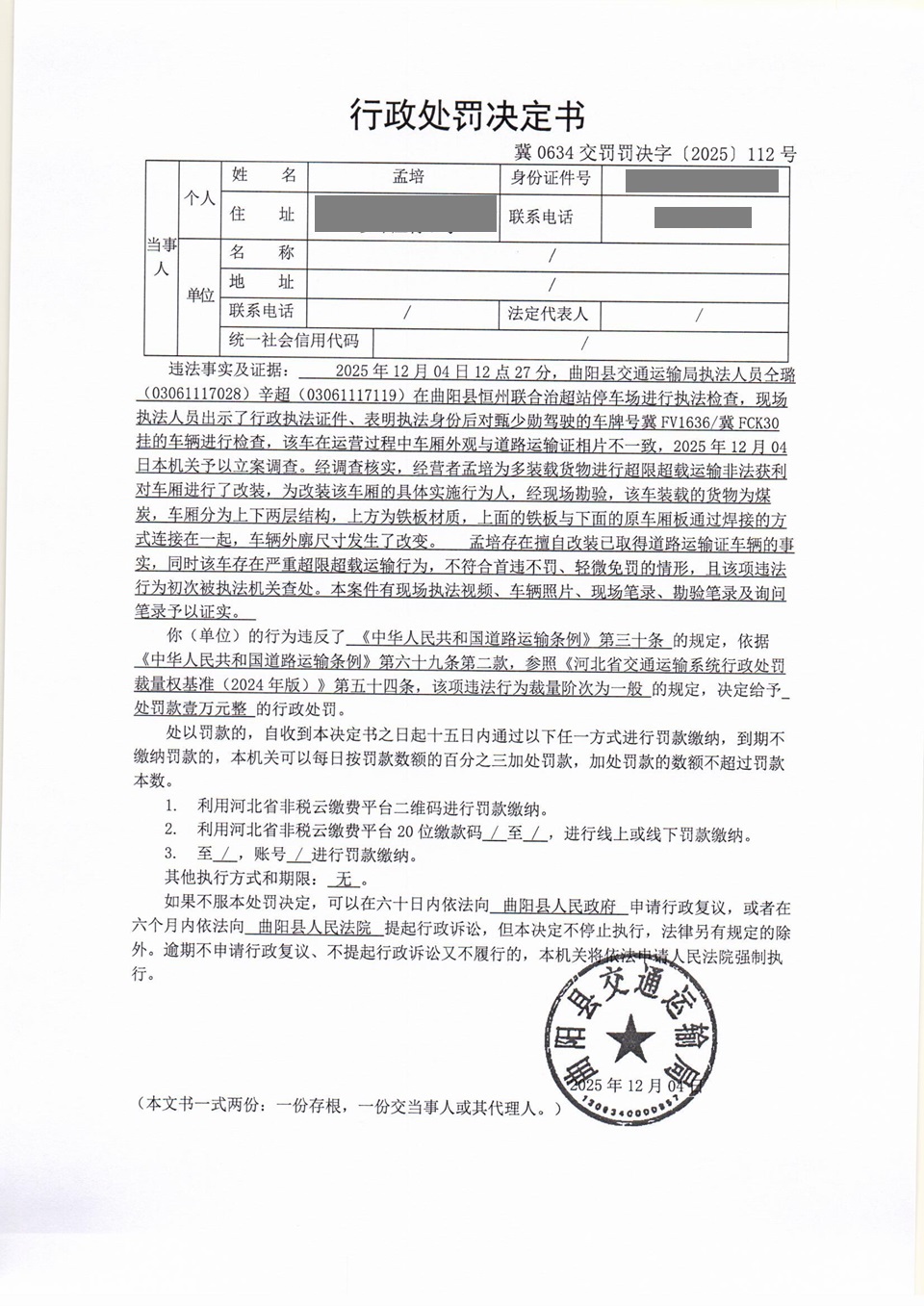 孟培擅自改装已取得道路运输证的车辆冀0634交罚〔2025〕112号
