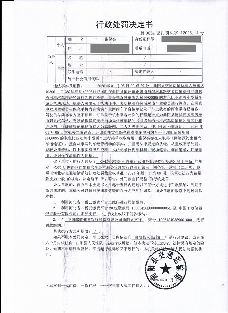 崔保亮未取得《网络预约出租汽车运输证》,擅自从事网约车经营活动冀0634交罚〔2026〕4号