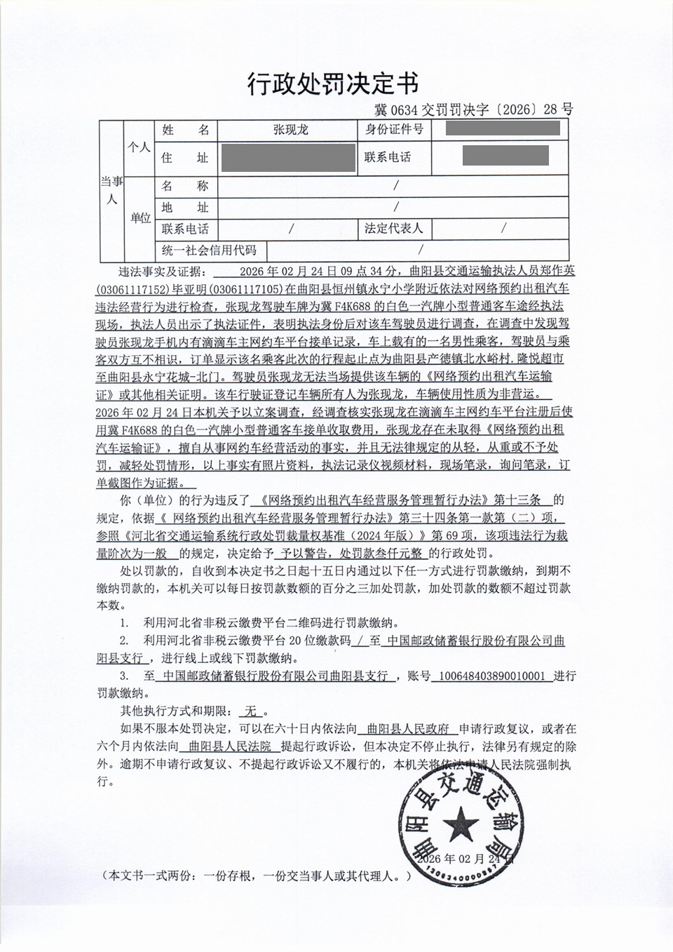 张现龙未取得《网络预约出租汽车运输证》,擅自从事网约车经营活动 冀0634交罚〔2026〕28号
