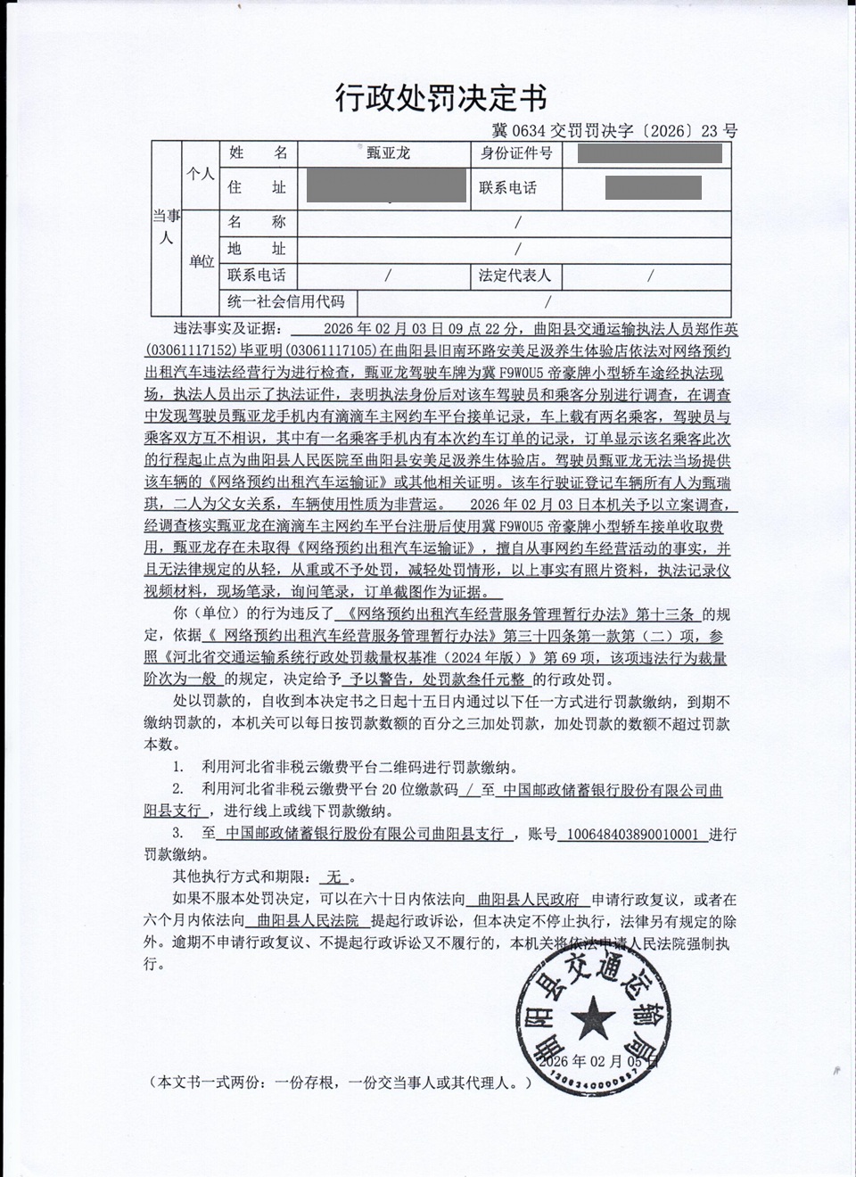 甄亚龙未取得《网络预约出租汽车运输证》,擅自从事网约车经营活动 冀0634交罚〔2026〕23号
