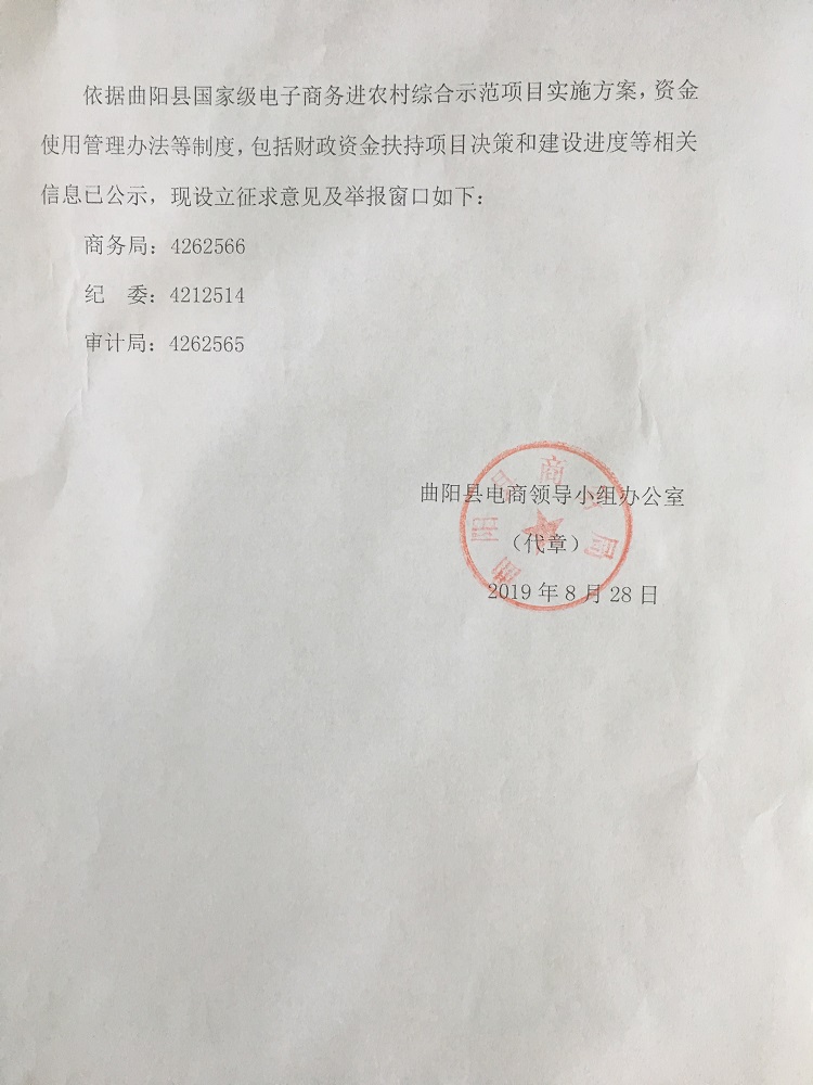 曲阳县电子商务进农村综合示范项目方案征求意见及举报窗口