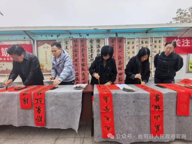 四、楹联送祝福 “情满桑榆贾庄盛举重阳宴、爱盈耄耋村巷同斟长寿觞香”“采得菊花堪入酒、拾来红叶好题诗”……贾庄村邀请县楹联学会的书法家们现场挥毫泼墨,围绕重阳节主题创作楹联作品。书法家们笔走龙蛇,一幅幅寓意吉祥、饱含祝福的楹联跃然纸上,不仅展现了中华传统文化的魅力,更将对老人们的美好祝愿融入笔墨之中。村民们纷纷领取楹联,将这份独特的节日礼物带回家,让墨香与温情伴随整个重阳。
