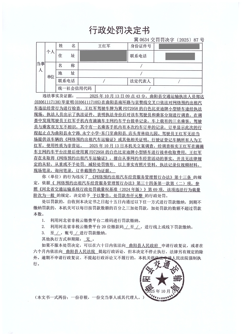 王红军未取得《网络预约出租汽车运输证》,擅自从事网约车经营活动冀0634交罚〔2025〕87号