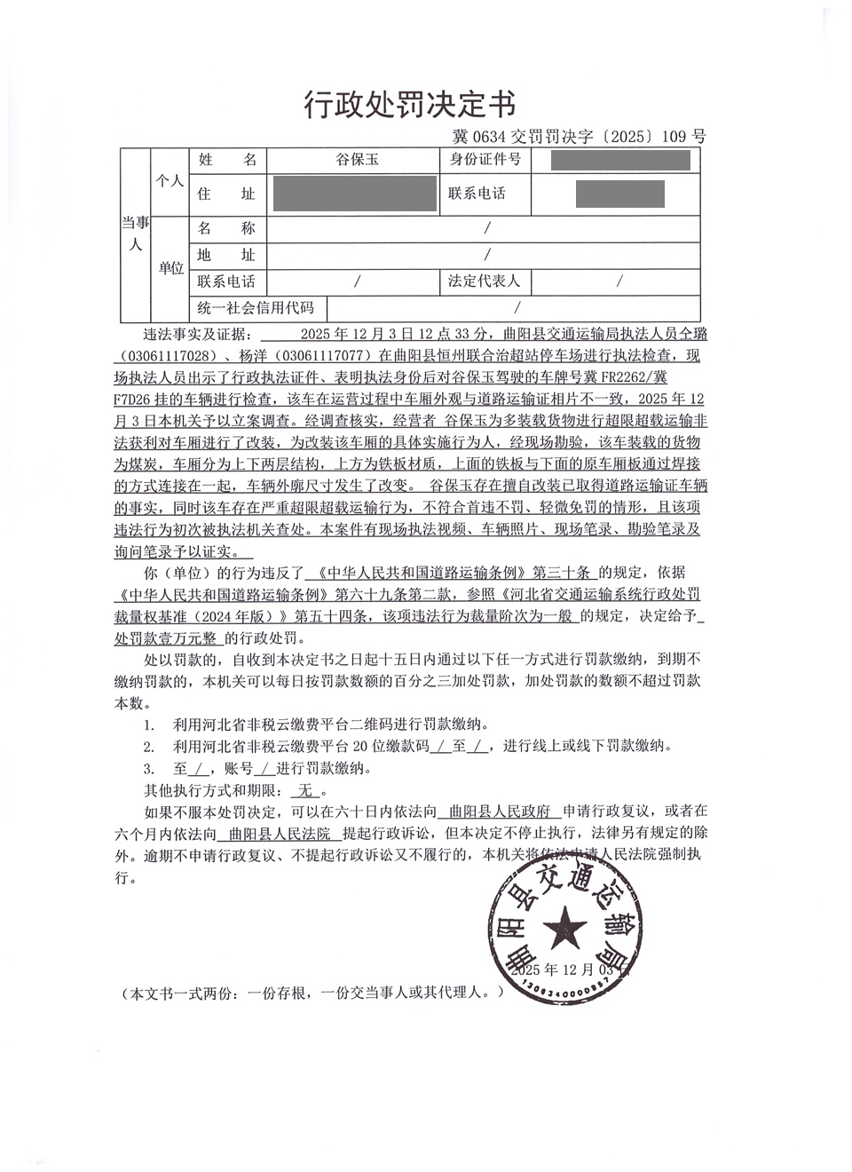 谷保玉擅自改装已取得道路运输证的车辆冀0634交罚〔2025〕109号