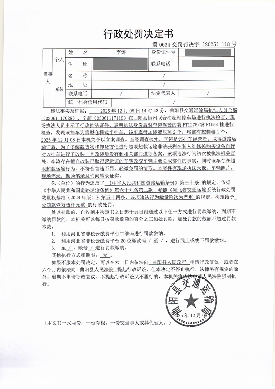 李涛擅自改装已取得营运证的车辆冀0634交罚〔2025〕118号