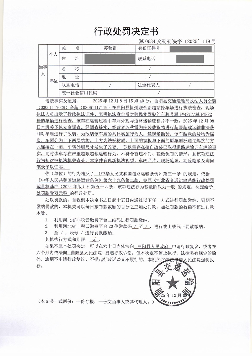 苏秋雷擅自改装已取得道路运输证的车辆冀0634交罚〔2025〕119号