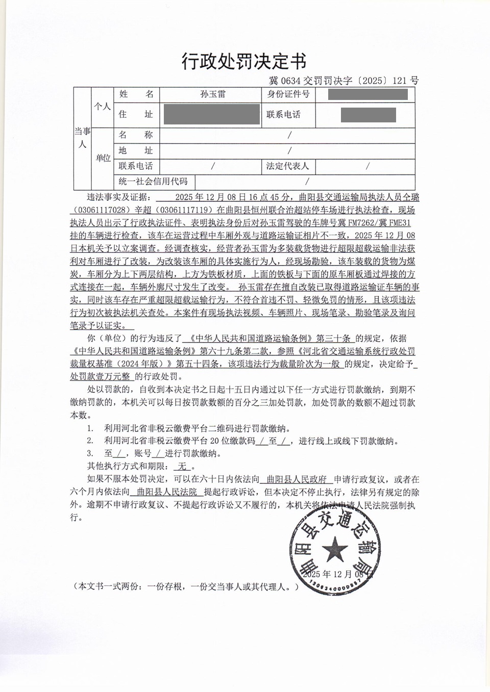 孙玉雷擅自改装已取得道路运输证的车辆冀0634交罚〔2025〕121号