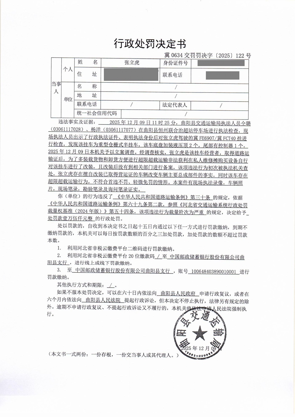 张立虎擅自改装已取得营运证的车辆冀0634交罚〔2025〕122号