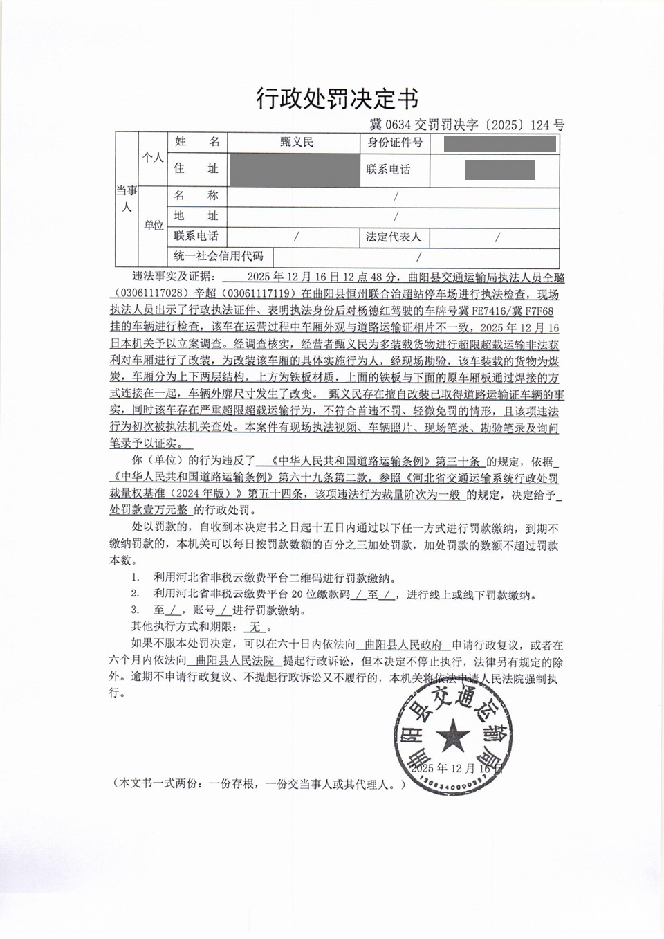 甄义民擅自改装已取得道路运输证的车辆冀0634交罚〔2025〕124号