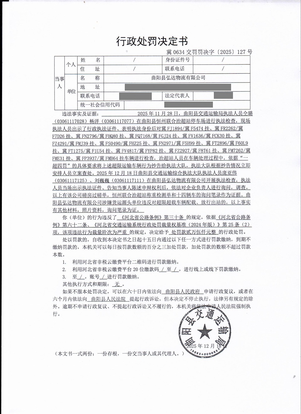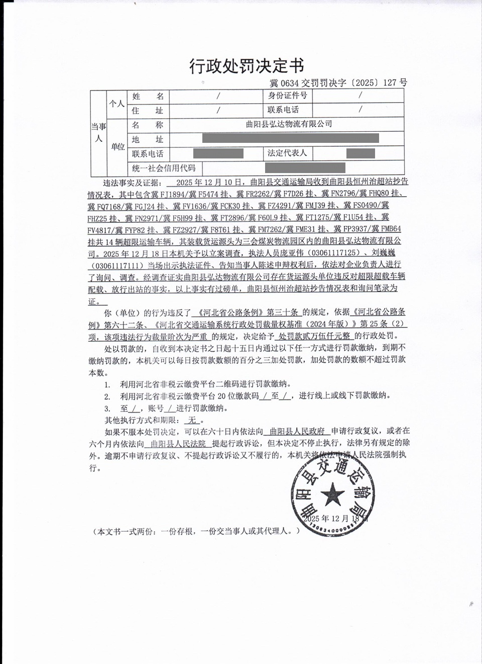 曲阳县弘达物流有限公司货运源头单位违反对超限超载车辆配载、放行出站 冀0634交罚〔2025〕127号