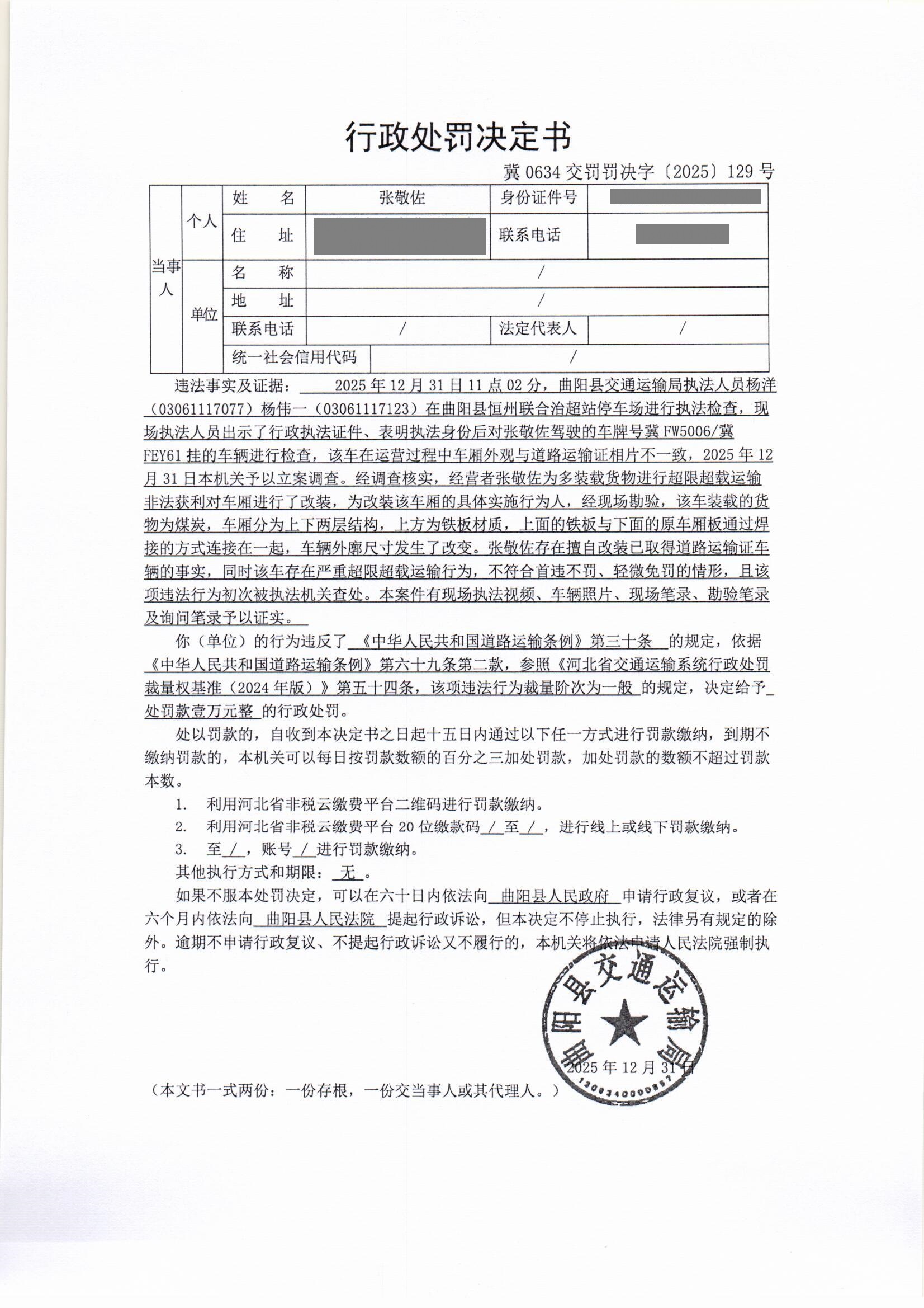 张敬佐擅自改装已取得道路运输证的车辆冀0634交罚〔2025〕129号