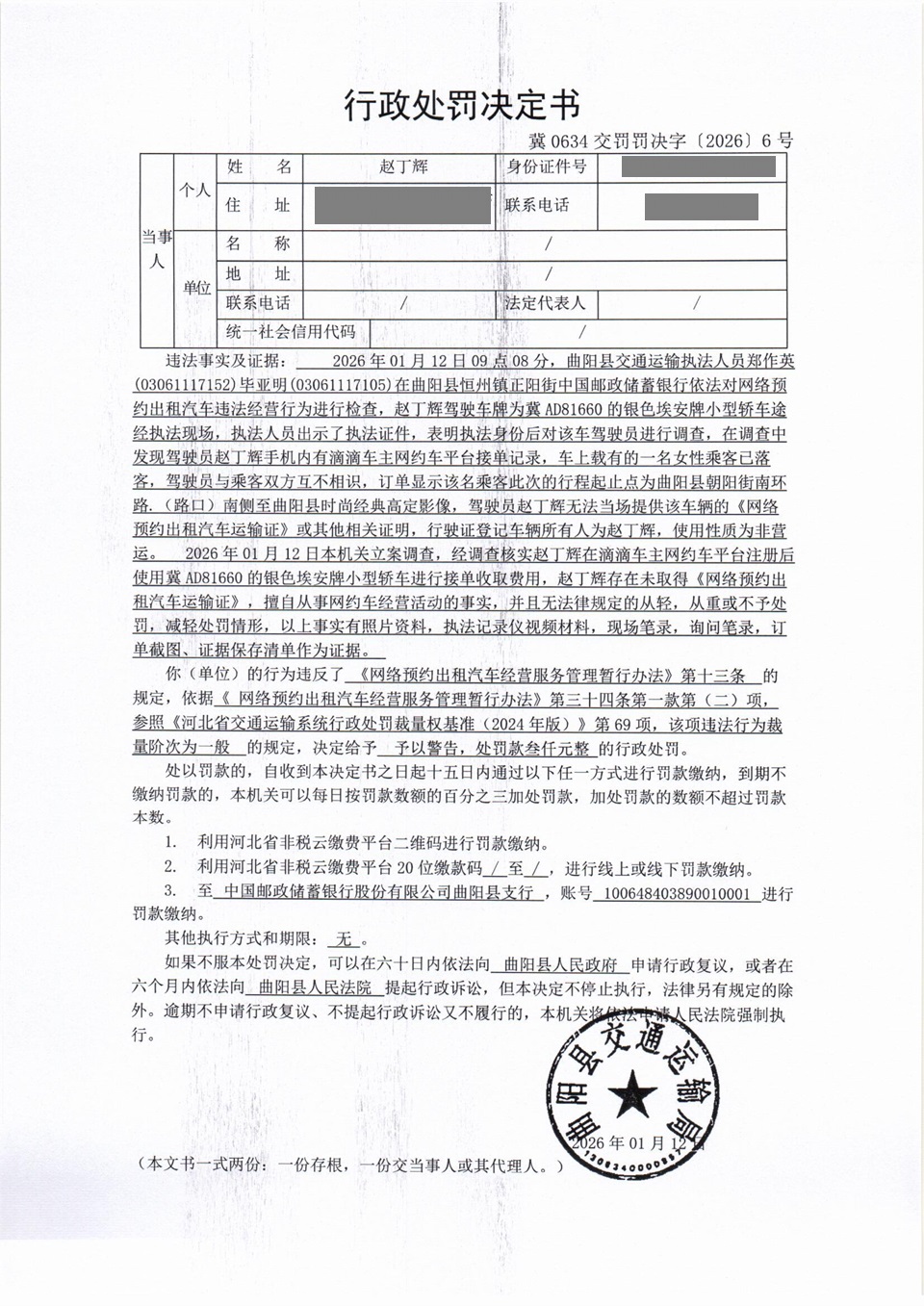 赵丁辉未取得《网络预约出租汽车运输证》,擅自从事网约车经营活动 冀0634交罚〔2026〕6号