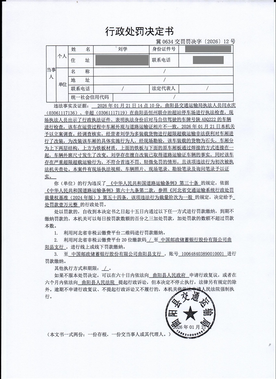 刘学擅自改装已取得道路运输证的车辆 冀0634交罚〔2026〕12号