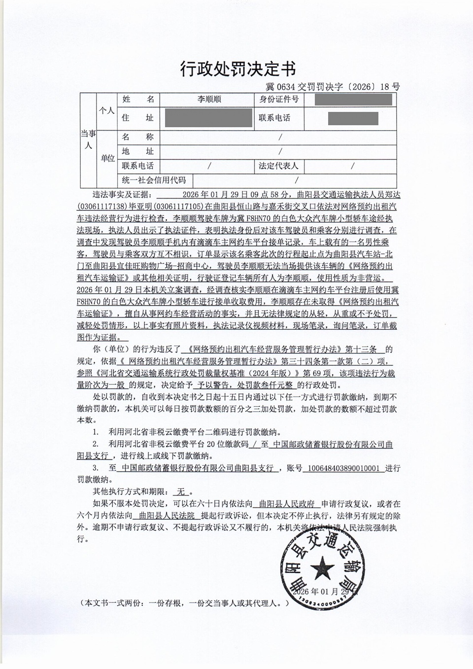 李顺顺未取得《网络预约出租汽车运输证》,擅自从事网约车经营活动行为 冀0634交罚〔2026〕18号