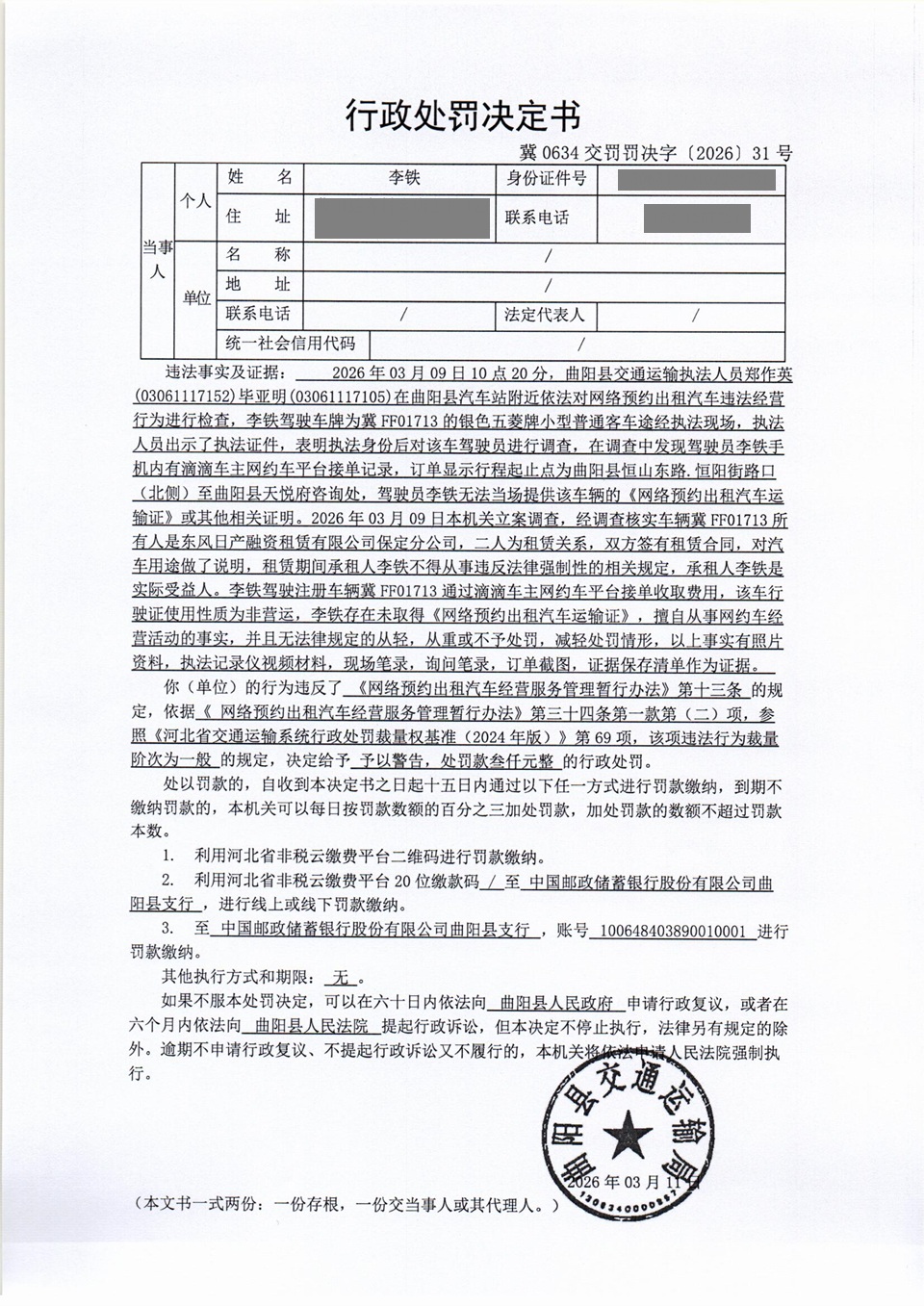 李铁未取得《网络预约出租汽车运输证》,擅自从事网约车经营活动 冀0634交罚〔2026〕31号