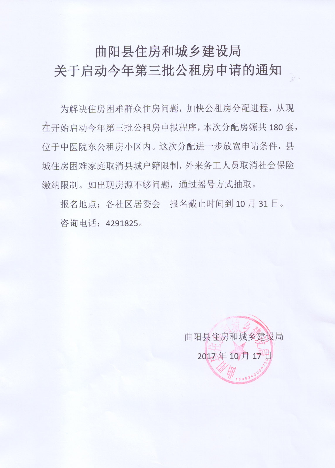 曲阳县住房和城乡建设局关于启动今年第三批公租房申请的通知