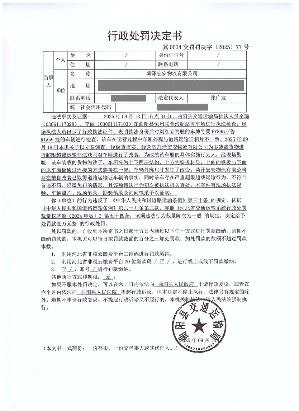 菏泽宏安物流有限公司涉嫌擅自改装已取得道路运输证的车辆冀0634交罚〔2025〕77号