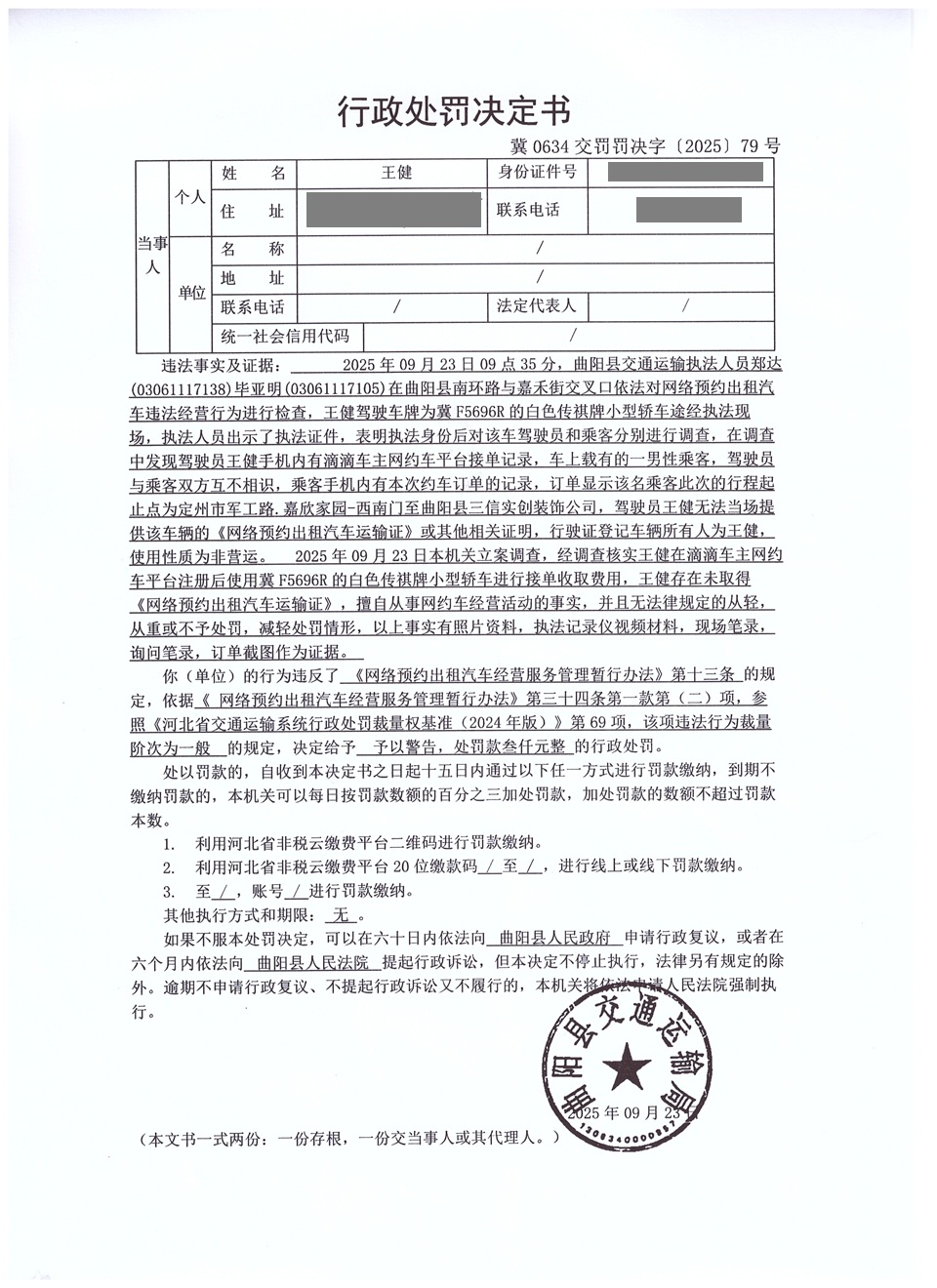 王健未取得《网络预约出租汽车运输证》,擅自从事网约车经营活动冀0634交罚〔2025〕79号