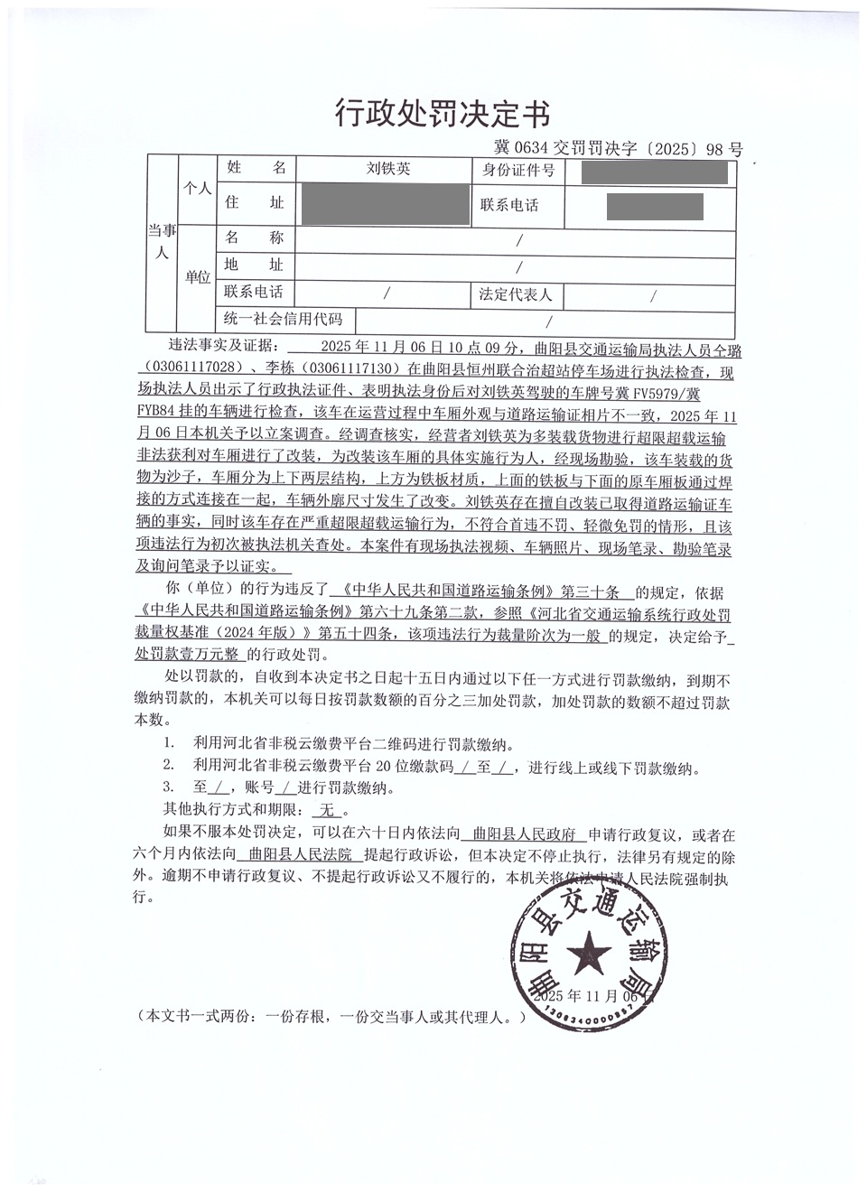 刘铁英擅自改装已取得道路运输证的车辆冀0634交罚〔2025〕98号