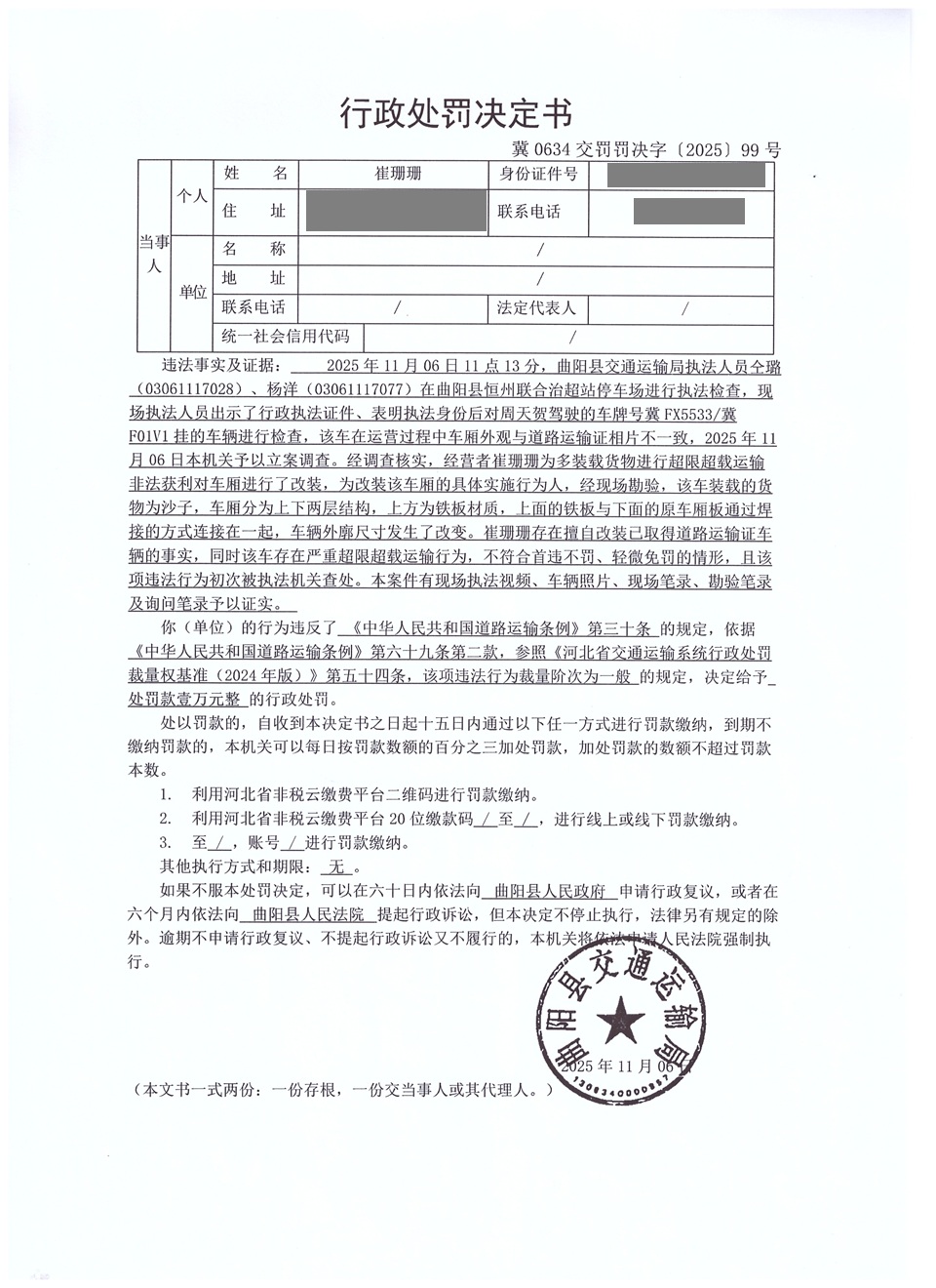 崔珊珊擅自改装已取得道路运输证的车辆冀0634交罚〔2025〕99号