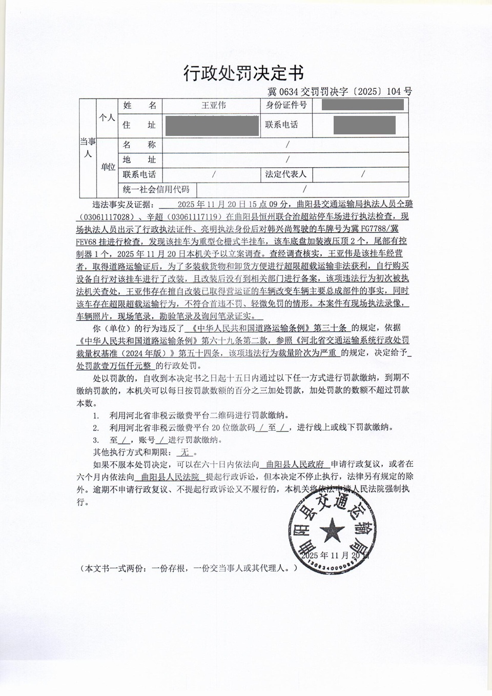 王亚伟擅自改装已取得营运证的车辆冀0634交罚〔2025〕104号