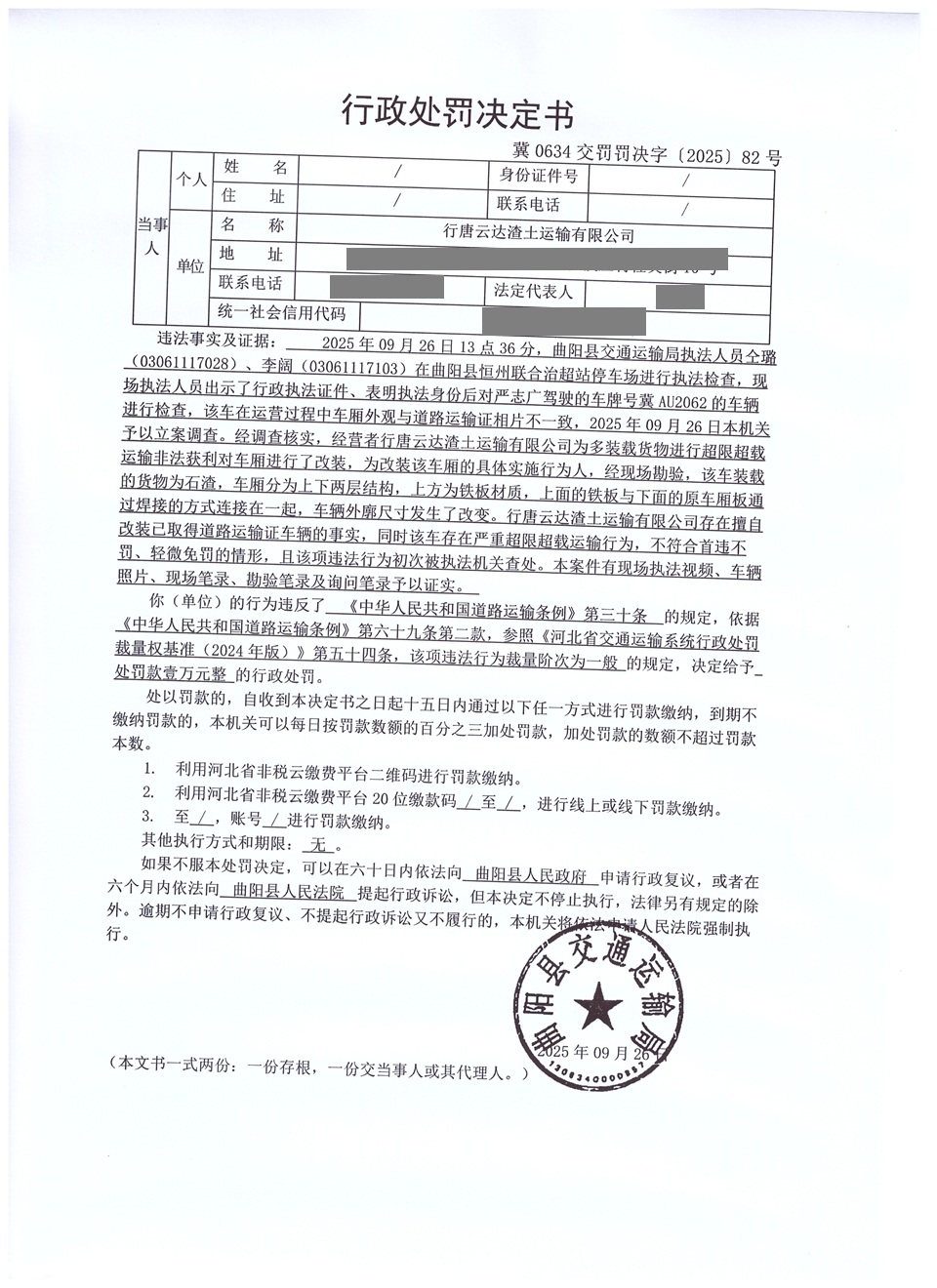行唐云达渣土运输有限公司擅自改装已取得道路运输证的车辆冀0634交罚〔2025〕82号