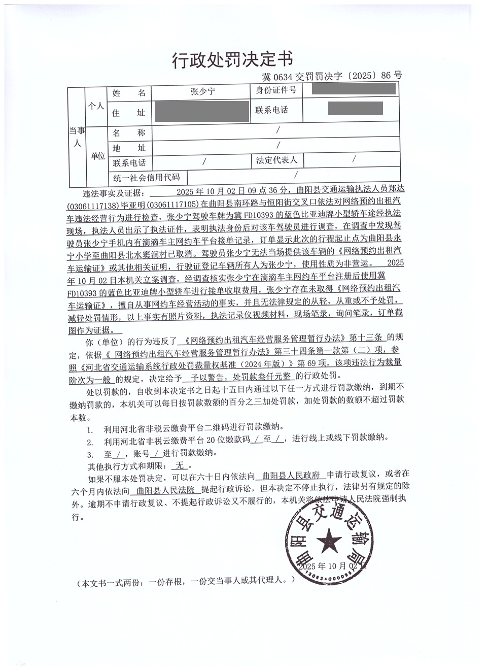 张少宁未取得《网络预约出租汽车运输证》,擅自从事网约车经营活动冀0634交罚〔2025〕86号