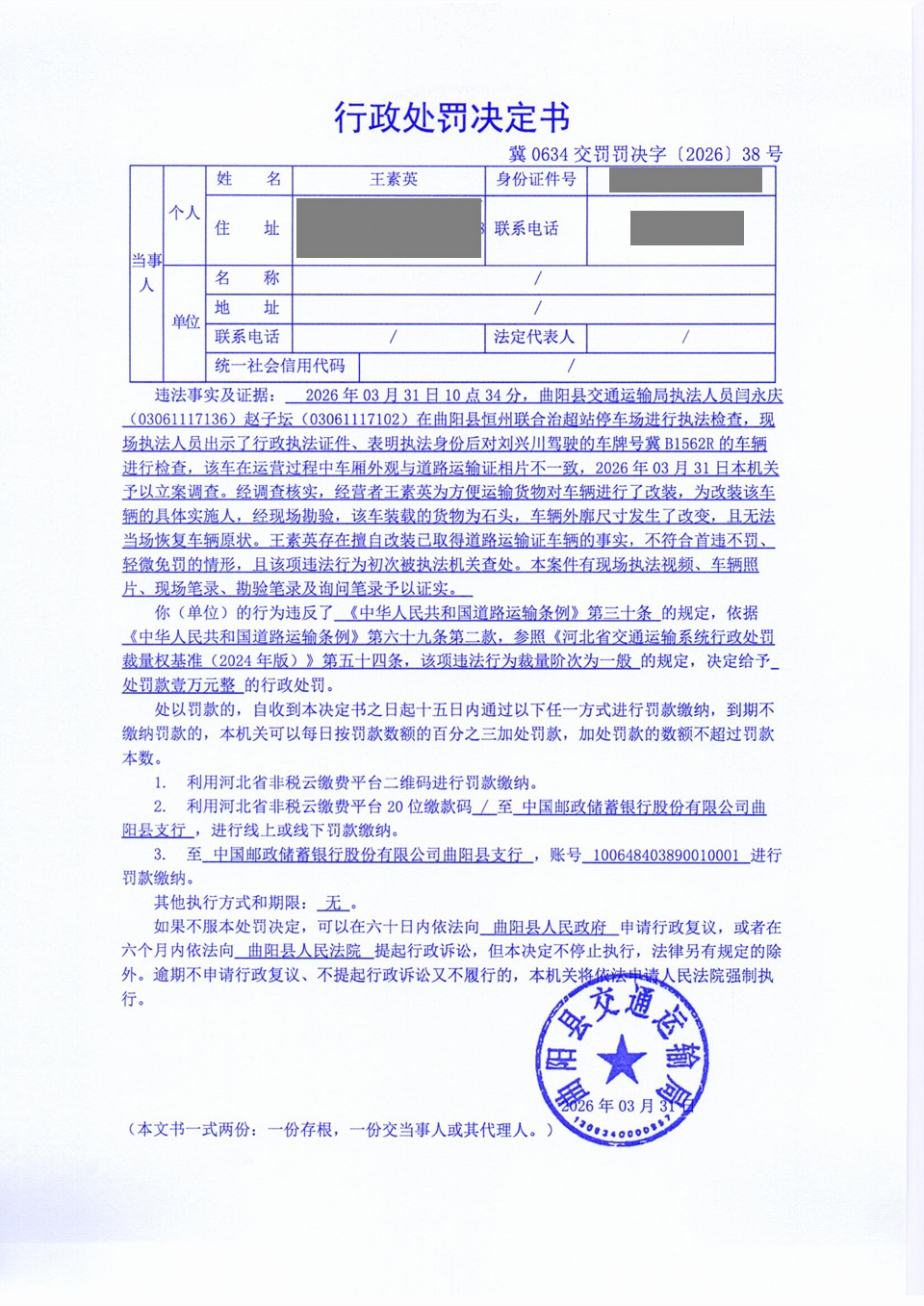 王素英擅自改装已取得道路运输证的车辆 冀0634交罚〔2026〕38号