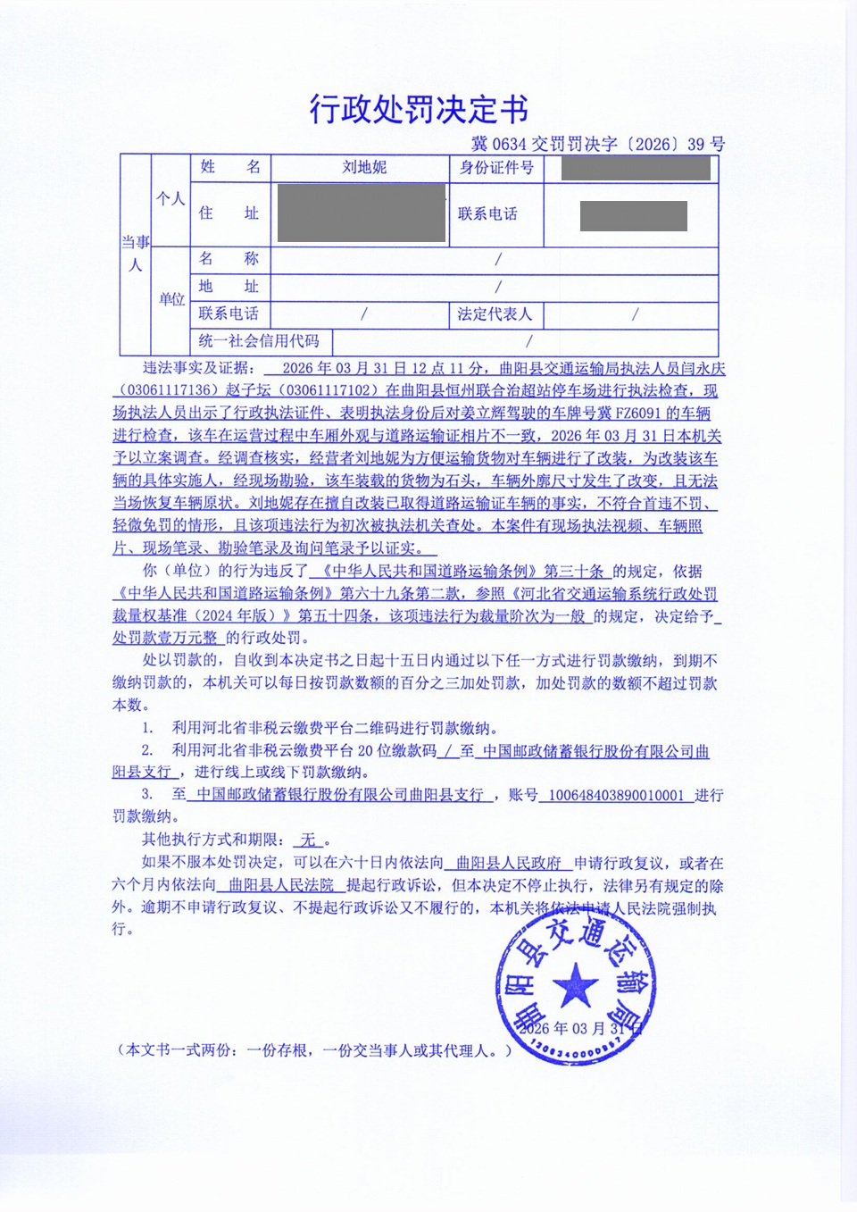 刘地妮擅自改装已取得道路运输证的车辆 冀0634交罚〔2026〕39号
